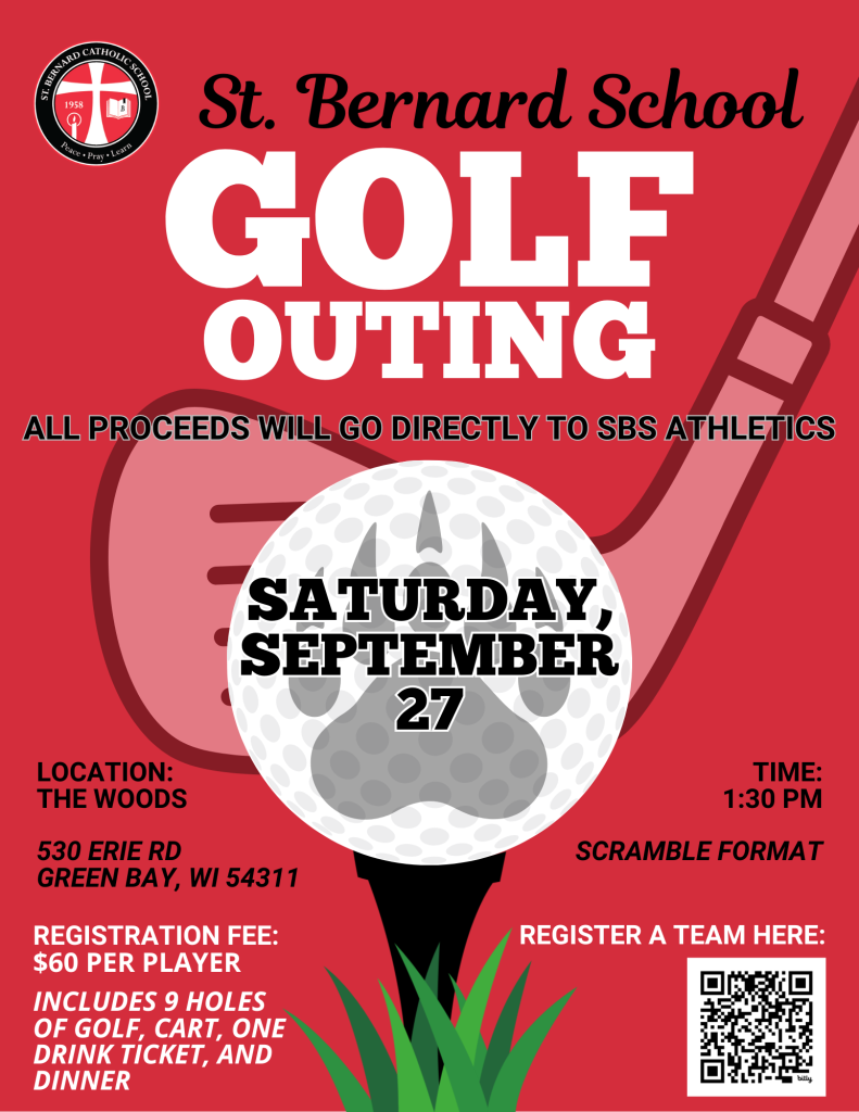 We are thrilled to announce the first-ever St. Bernard School Golf Outing happening on Saturday, September 27, at The Woods Golf Course in Green Bay! This exciting new event is a chance for families, friends, and community members to come together, enjoy a fun afternoon of golf, and support SBS Athletics.